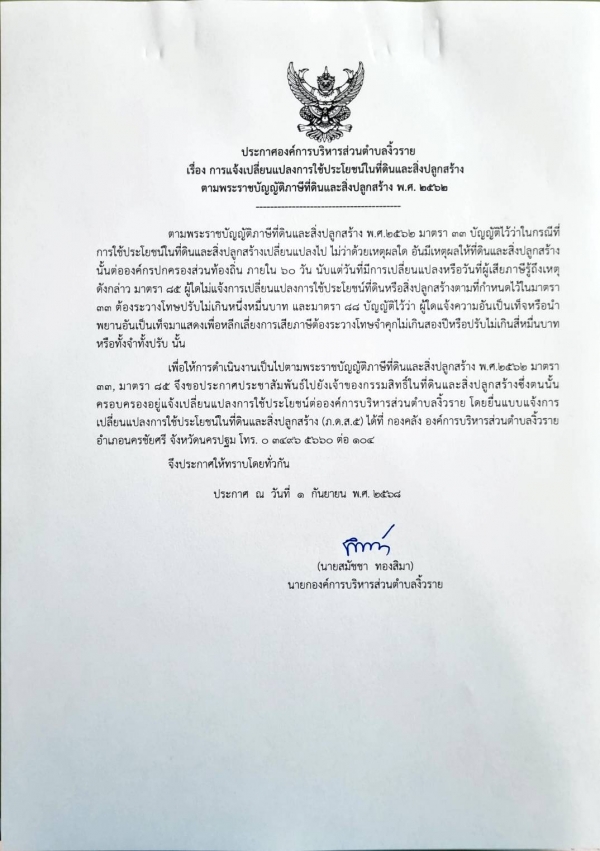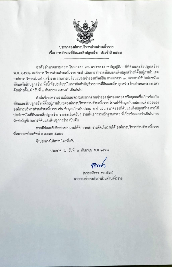เรื่อง แจ้งการเข้าสำรวจที่ดิน สิ่งปลูกสร้างและป้าย ที่อยู่ในเขต องค์การบริหารส่วนตำบลงิ้วรายเพื่อใช้ในการจัดเก็บภาษี ประจำปี พ.ศ.2569