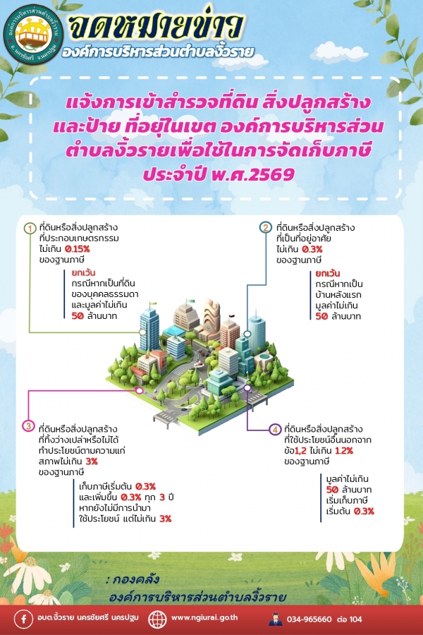 ข่าวประชาสัมพันธ์ จากองค์การบริหารส่วนตำบลงิ้วราย เรื่อง แจ้งการเข้าสำรวจที่ดิน สิ่งปลูกสร้างและป้าย ที่อยู่ในเขต องค์การบริหารส่วนตำบลงิ้วรายเพื่อใช้ในการจัดเก็บภาษี ประจำปี พ.ศ.2569
