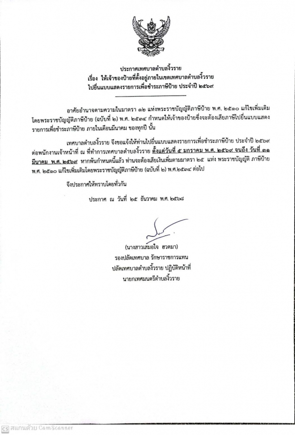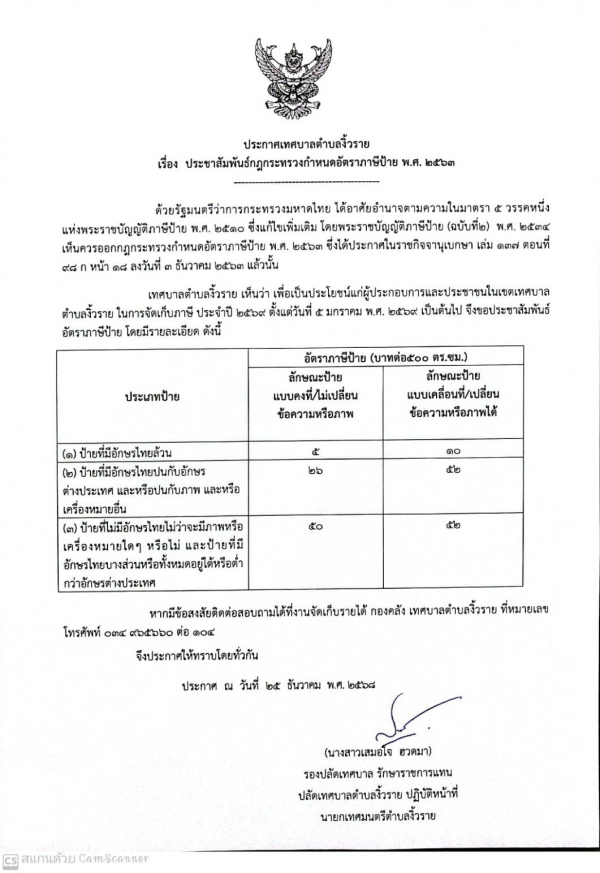 ประกาศเทศบาลตำบลงิ้วราย เรื่องประชาสัมพันธ์กฎกระทรวงกำหนดอัตราภาษีป้าย พ.ศ.2563