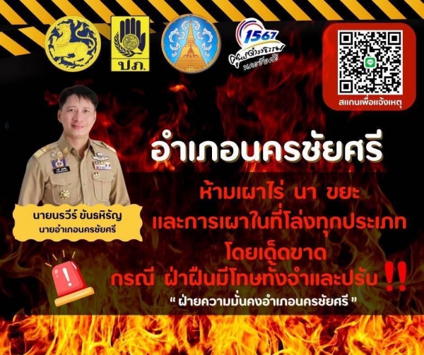 ขอแจ้งข่าวประชาสัมพันธ์ ขอความร่วมมือประชนทุกพื้นที่ ห้ามเผาไร่ นา ขยะ และการเผาในที่โล่งทุกประเภท โดยเด็ดขาด !!! เพื่อลดปัญหามลพิษทางอากาศ และฝุ่นละอองขนาดเล็ก (PM 2.5) ซึ่งก่อให้เกิดอันตรายต่อสุขภาพ