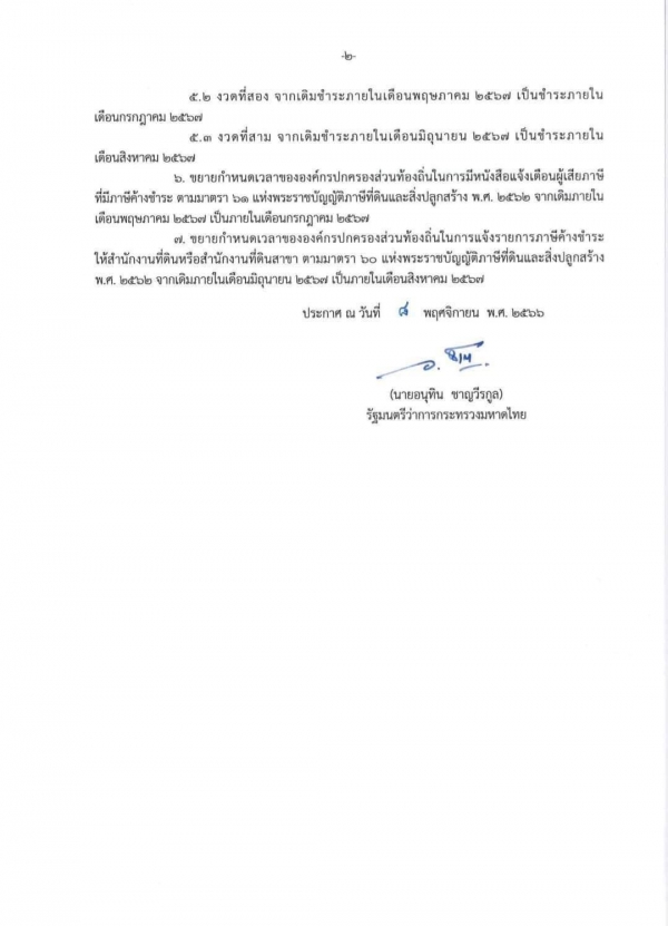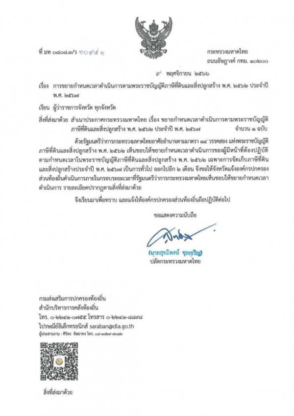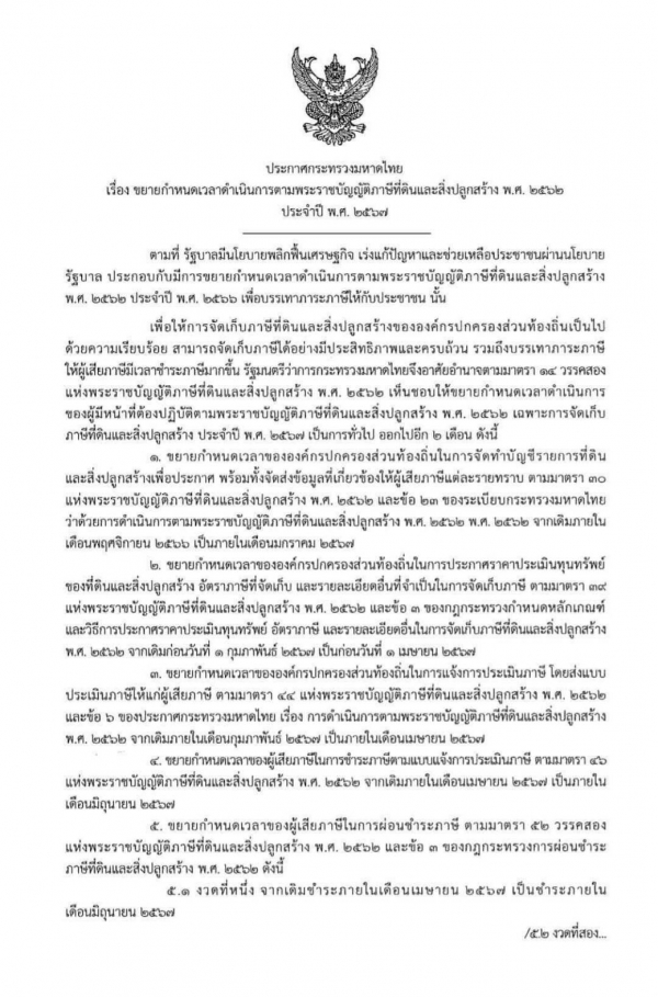 การขยายกำหนดเวลาดำเนินการตามพระราชบัญญัติภาษีที่ดินและสิ่งปลูกสร้าง พ.ศ. 2562 ประจำปี พ.ศ.2567
